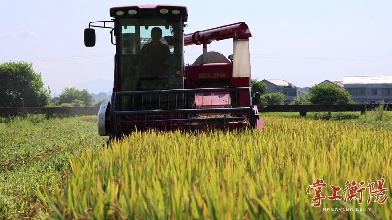 在祁东县步云桥镇江东村,连片的稻田铺展开一幅壮丽的金色画卷。饱满的稻穗随风摇曳,一台台联合收割机往来穿梭,收割、脱粒、装车一气呵成。
