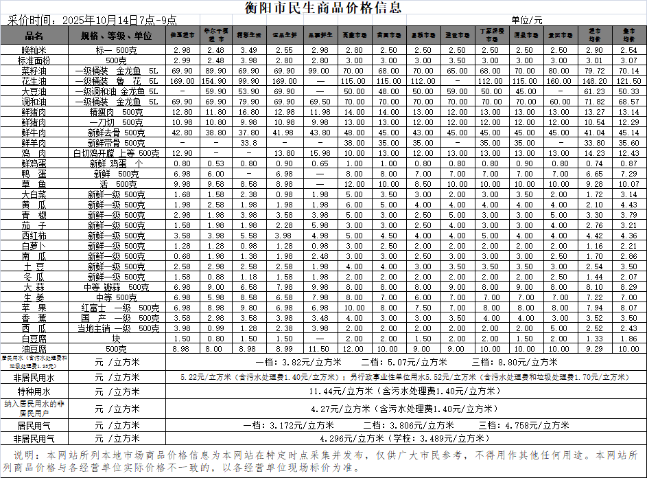 【物价】 2025-10-14衡阳市民生价格信息